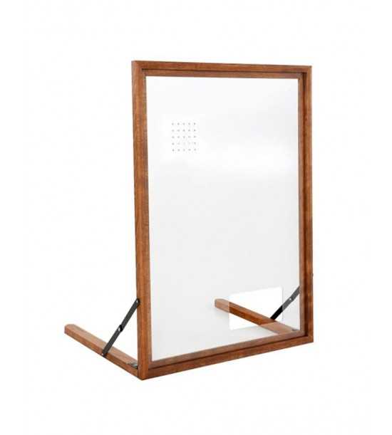 Hygiënische afscheider voor tafel, bureau of toonbank (geïntegreerde voeten), in donker beukenhout en acrylglas. Formaat 594x841x250mm.